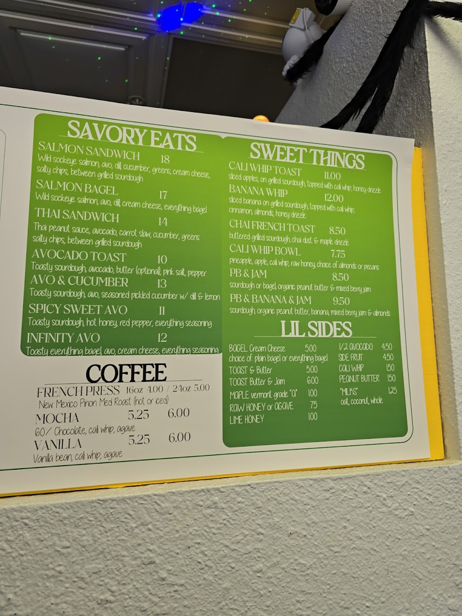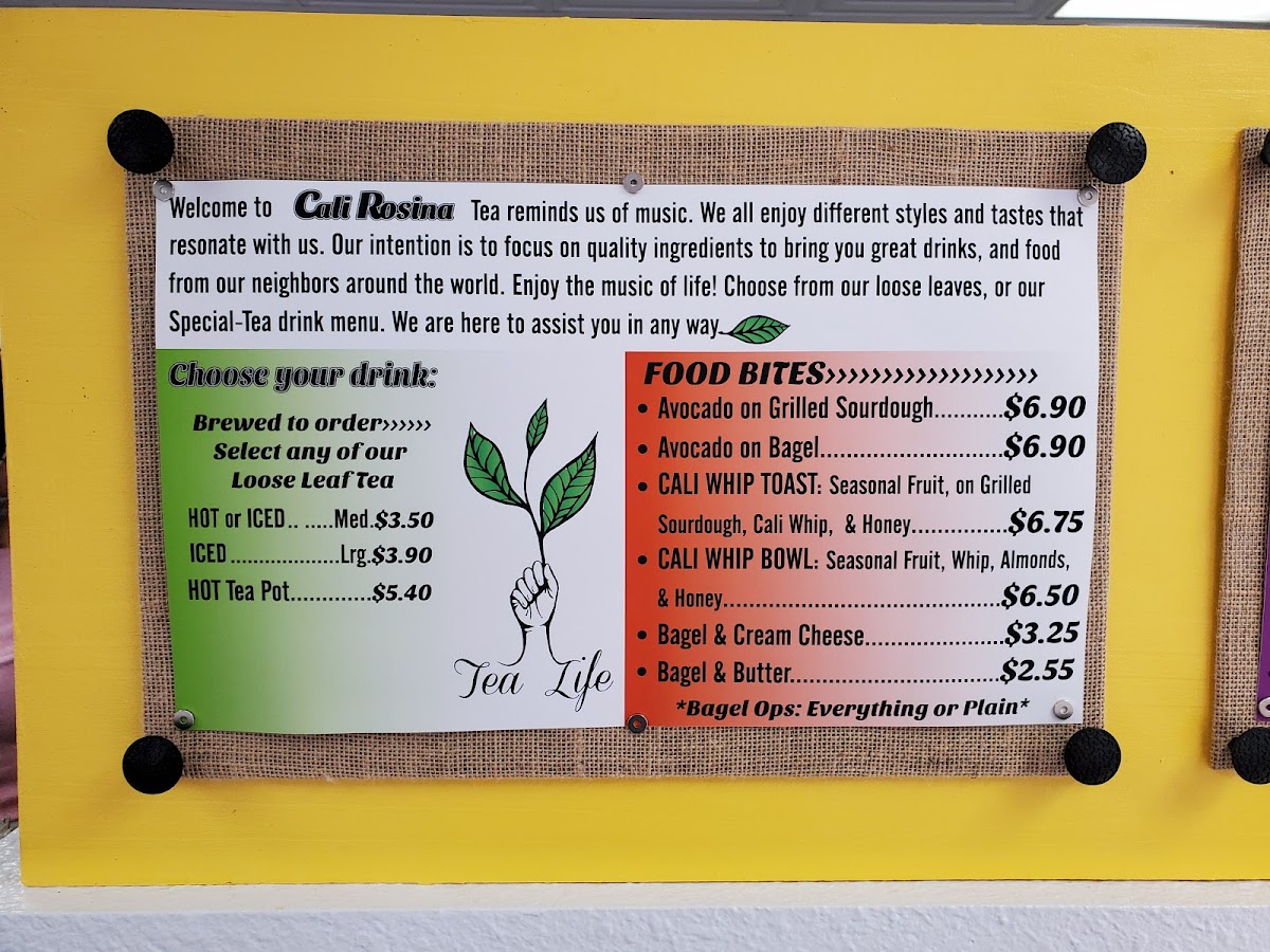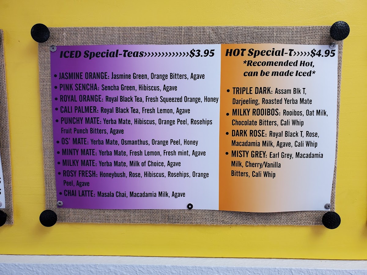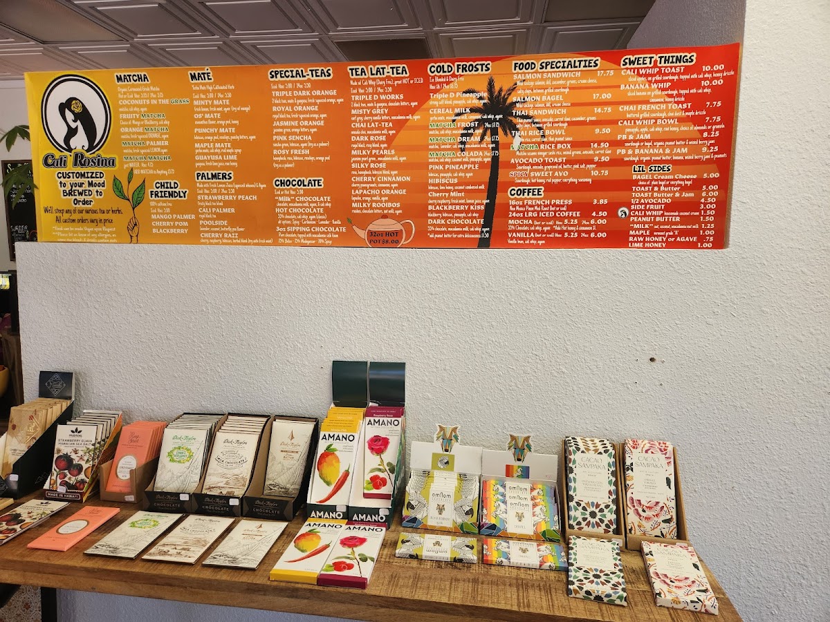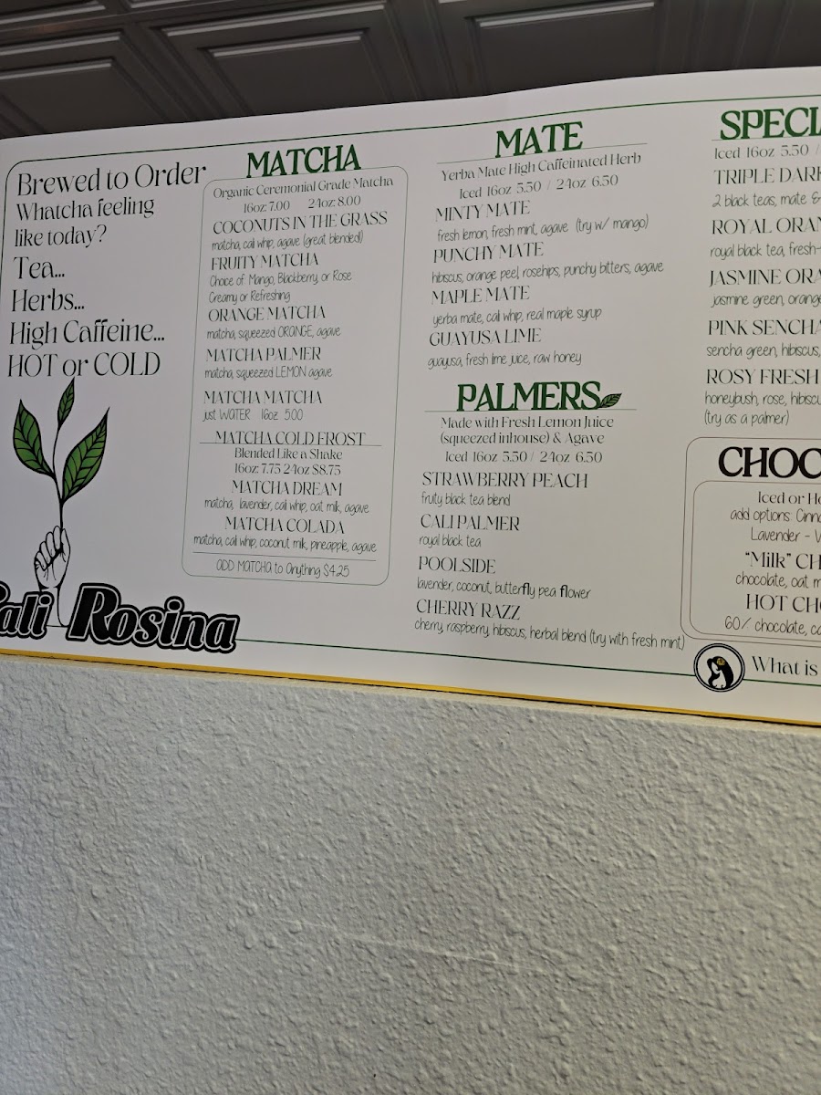 Cali Rosina Tea Shop offers a vibrant and eclectic menu that caters to both adventurous tea lovers and those seeking satisfying bites. Their Matcha selection features creative options like Coconuts In The Grass, Fruity Matcha, Orange MatchaPalmer, and Matcha Matcha, each promising a unique twist on the classic green tea experience. For mate enthusiasts, choices such as Minty Mate, Punchy Mate, Maple Mate, and Guayusa Lime bring refreshing and bold flavors to the table. The Palmers lineup, including Strawberry Peach, Cali Palmer, Poolside, and Cherry Razz, offers a fruity, invigorating take on iced drinks. On the savory side, the menu shines with hearty options like the Salmon Sandwich, Salmon Bagel, Thai Sandwich, Avocado Toast, and Avo & Cucumber, perfect for a light yet satisfying meal. Those with a sweet tooth will be drawn to treats like Cali Whip Toast, Banana Whip, Chai French Toast, Cali Whip Bowl, and Pb & Jam, all thoughtfully prepared to complement the drinks. Smaller bites, under Lil Sides, such as Bogel Cream Cheese, Coli Whp, Toost Butter & Jam, Peanut Butter, and Lime Honey, make for ideal accompaniments. Coffee drinkers are not left out, with staples like French Press, Mocha, and Vanilla rounding out the beverage offerings. For those seeking something unique, the Iced Special-Teas and Hot Special-T selections, including Jasmine Orange, Pink Sencha, Royal Orange, Cali Palmer, Punchy Mate, Triple Dark, Milky Rooibos, Dark Rose, and Misty Grey, provide a variety of complex and aromatic profiles. Finally, additional options like Triple Dare, Royal Oran, Jasmine Ora, Pink Sencha, and Rosy Fresh offer adventurous flavors for the curious palate. Overall, Cali Rosina Tea Shop delivers a colorful, creative menu that balances playful drinks, savory bites, and indulgent sweets, making it a must-visit destination for those in La Quinta looking for both comfort and innovation in every sip and bite.